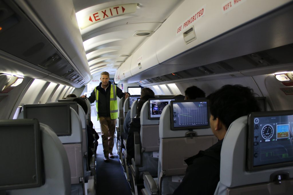 The figurehead of the NFLC is its ‘flying classroom’, a modified aircraft that allows up to 24 students at a time to learn about flight while experiencing it for themselves. During a lesson in the flying classroom, students can access real-time flight data (including aircraft aerodynamics, engine performance and navigation) through tablet screens mounted on the back of each seat.