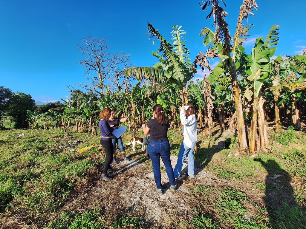 Team members interview a banana farmer.